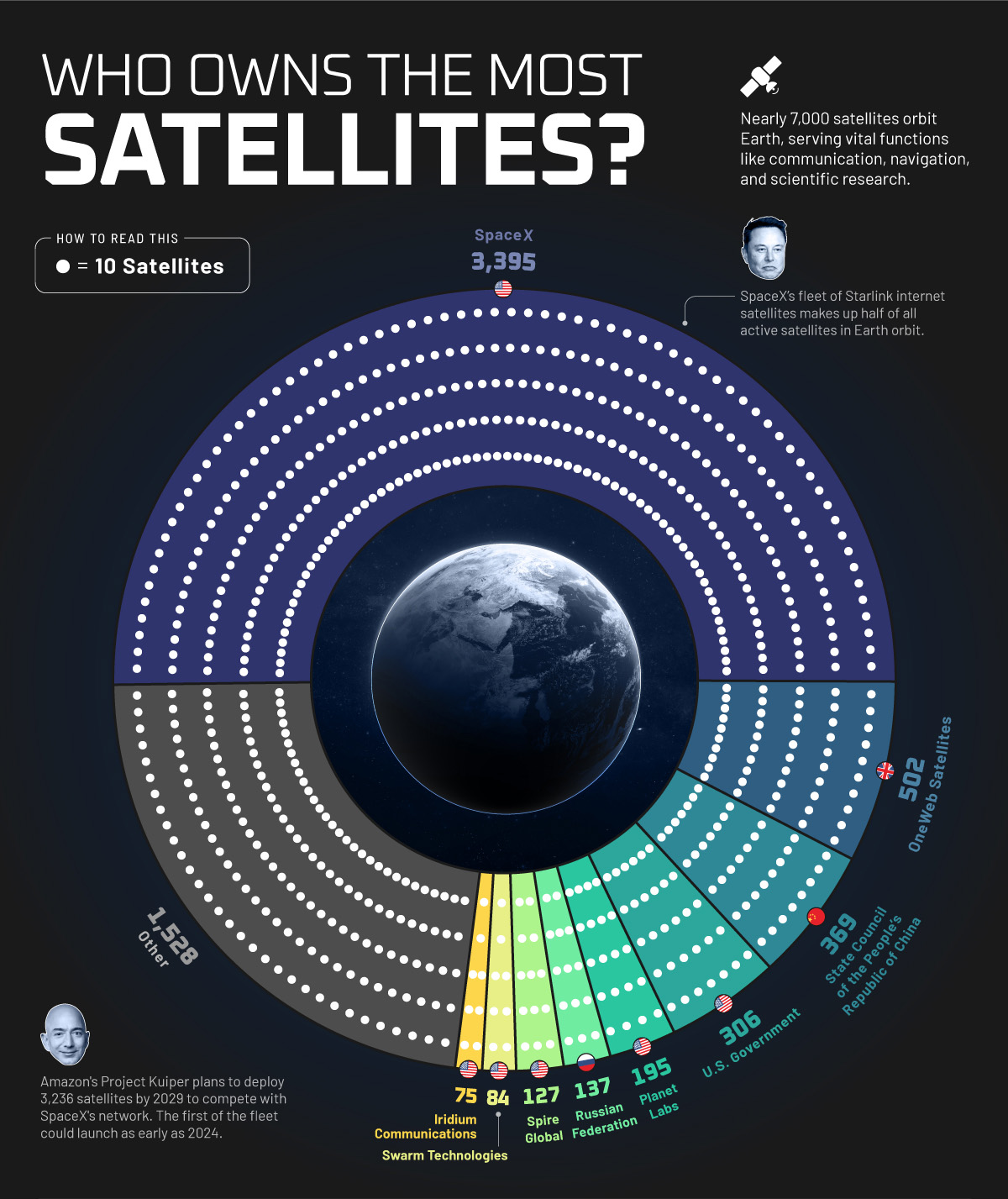 Satellite Networks Boom: SpaceX Dominates Orbit SpaceX’s Starlink satellites have redefined Earth’s orbit. The image shows thousands of these spacecraft covering the planet like a constellation, and their overwhelming numbers now eclipse the fleets of governments and legacy providers. In 2025, SpaceX has more than 8,000 Starlink satellites in orbit, with new launches happening every
